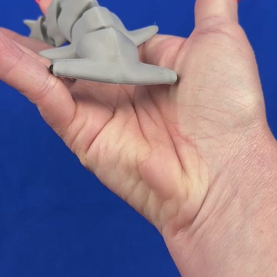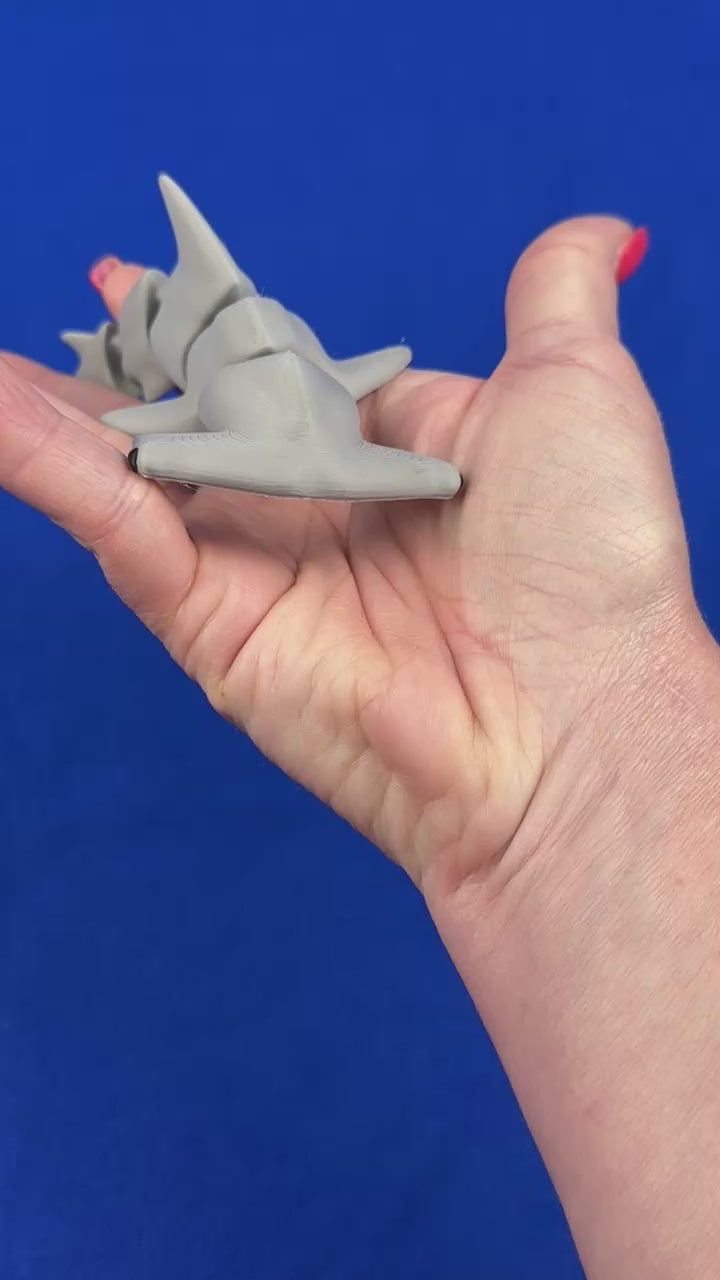 Add an ocean-inspired accent to your space with this articulated hammerhead shark, 3D printed in vibrant multi-color PLA and hand-finished to clean up key details. Its posable design makes it a satisfying desk or shelf piece with a unique tactile charm.