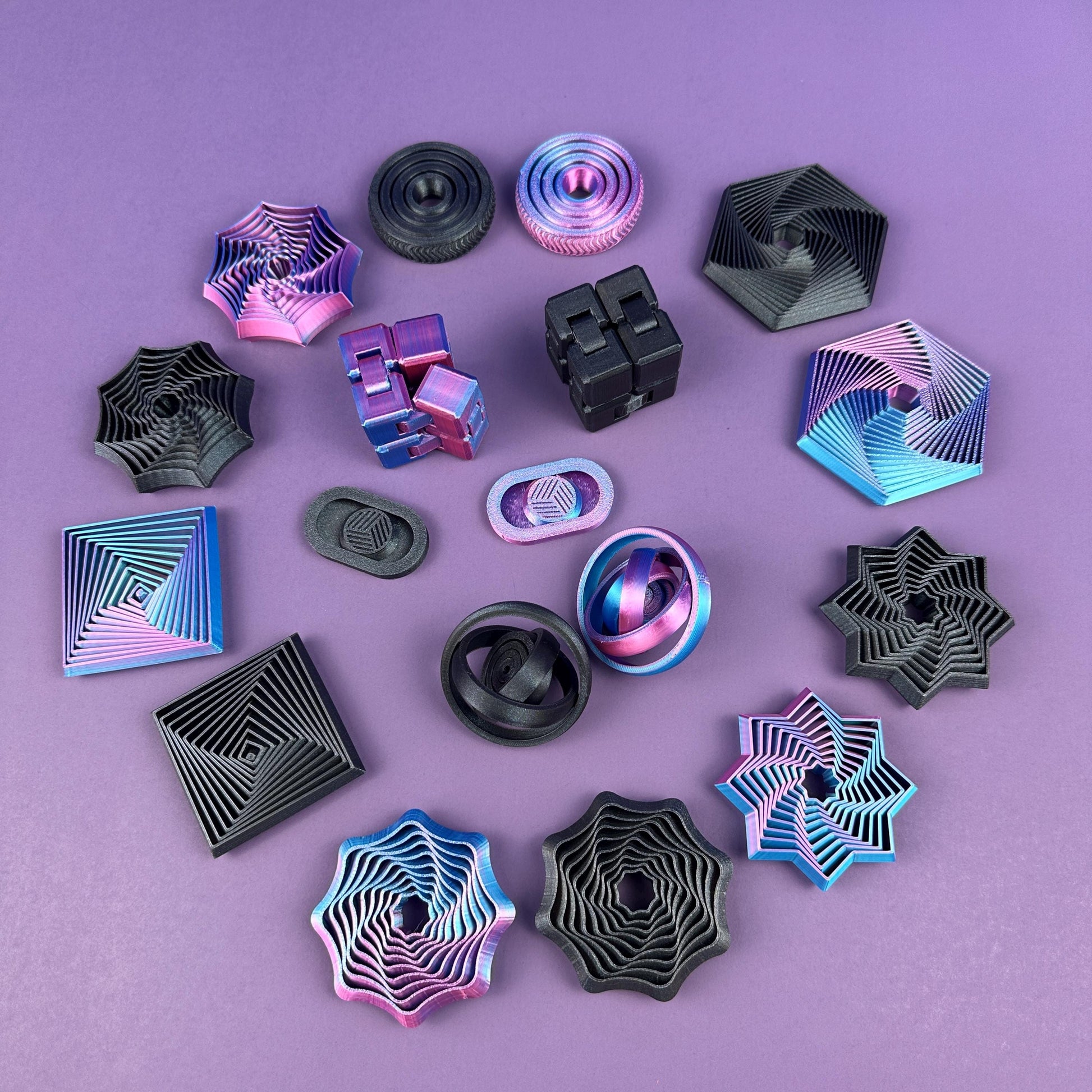 Every fidget is printed and cleaned up in-house. Some models may feel stiff at first—that’s normal! A brief break-in period makes them smoother and more enjoyable over time. Due to filament variation, slight color shifts may occur.