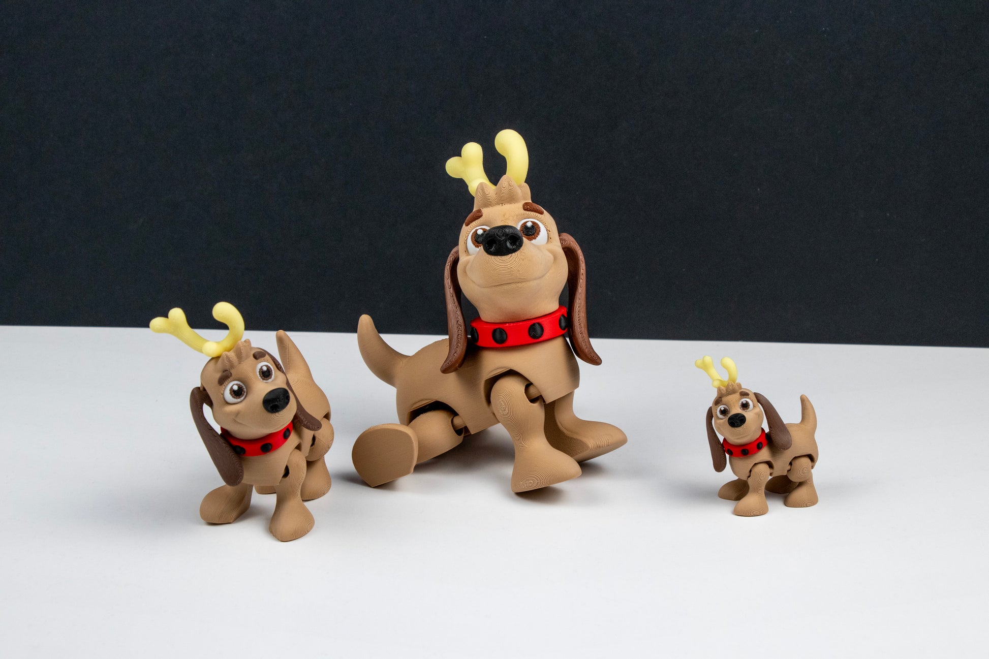 Each piece is printed in my workshop and carefully inspected after printing. I trim or lightly sand any imperfections to ensure a clean, polished result. The antler accent is individually attached by hand during the finishing process, giving Max a festive look with a secure, well-fitted detail. Slight filament variations may make each pup one-of-a-kind.